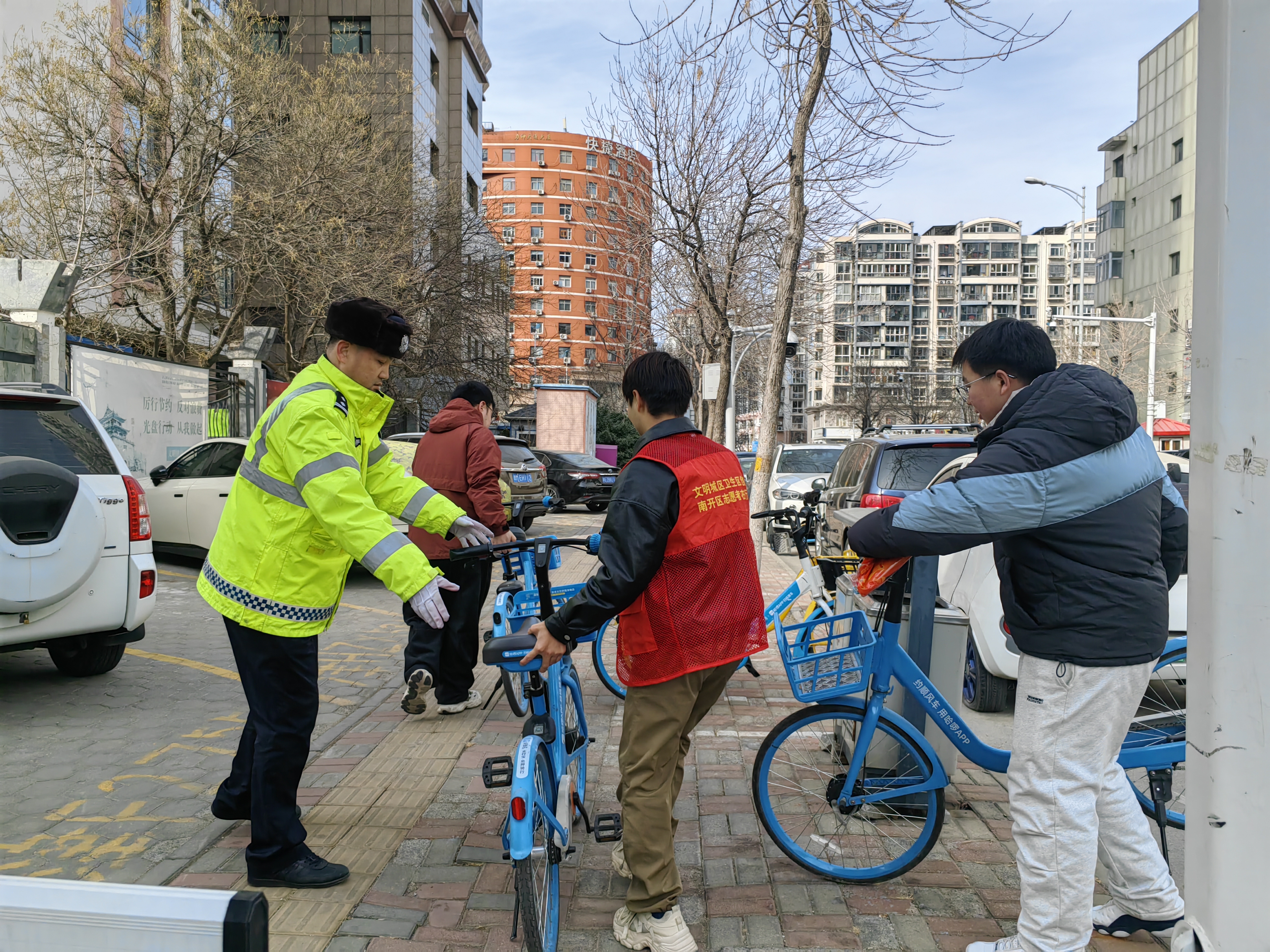 活動(dòng)中,民警與志愿者在交通安全主題公園向過往市民群眾發(fā)放“爭(zhēng)做文明有禮天津人”宣傳頁(yè),講解一盔一帶、規(guī)范停車、禮讓行人、拒絕酒駕等交通安全知識(shí),號(hào)召大家從自身做起,遵守交通法規(guī),爭(zhēng)做文明出行的踐行者。隨后,民警與志愿者清理了路口周邊亂停亂放的共享單車,并在黃河道與臨汾路交口參與交通執(zhí)勤疏導(dǎo),引導(dǎo)車輛和行人有序通行,規(guī)范交通秩序。