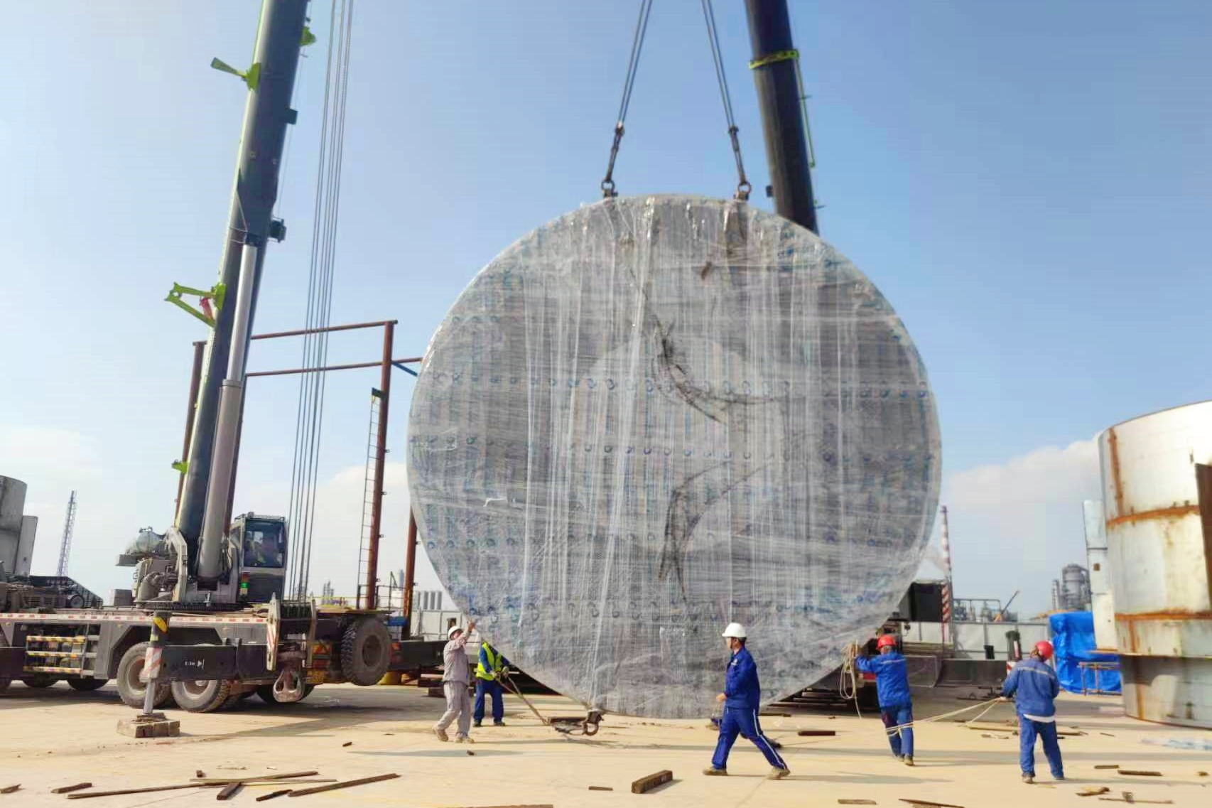 渤化工程是整個(gè)項(xiàng)目第一支正式進(jìn)駐項(xiàng)目現(xiàn)場(chǎng)施工隊(duì)伍,項(xiàng)目團(tuán)隊(duì)克服重重困難,完成與業(yè)主、與監(jiān)理單位、與特種設(shè)備監(jiān)檢機(jī)構(gòu)對(duì)接,確定了現(xiàn)場(chǎng)制造設(shè)備的管理方式,建立了協(xié)調(diào)程序。渤化工程也是整個(gè)項(xiàng)目第一家大件運(yùn)輸?shù)截泦挝?,運(yùn)輸公司沒有本地協(xié)調(diào)能力,車輛遲遲不能出高速收費(fèi)站。項(xiàng)目團(tuán)隊(duì)為保證工期,放棄中秋假期,全力以赴協(xié)調(diào)溝通,對(duì)接運(yùn)輸企業(yè)、對(duì)接慶陽(yáng)同欣、對(duì)接路政執(zhí)法大隊(duì)、對(duì)接高速收費(fèi)站、對(duì)接交警大隊(duì)等部門。最后在慶陽(yáng)同欣和當(dāng)?shù)卣块T的幫助下,管板、折流板運(yùn)輸車輛順利抵達(dá)項(xiàng)目現(xiàn)場(chǎng)。管板、折流板的到達(dá),標(biāo)志著反應(yīng)器現(xiàn)場(chǎng)制造的所有主體材料齊全,渤化工程反應(yīng)器現(xiàn)場(chǎng)制造工作全面展開。面對(duì)現(xiàn)場(chǎng)困難項(xiàng)目團(tuán)隊(duì)勠力同心、砥礪前行,以時(shí)不我待,只爭(zhēng)朝夕的精神,推進(jìn)反應(yīng)器的現(xiàn)場(chǎng)制造工作。確保安全生產(chǎn)無事故,保質(zhì)、保量、保交付。
